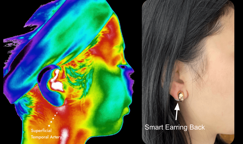 The skin just behind the ear is directly above a highly vascular region, capturing subtle vascular and thermoregulatory shifts correlated to estrogen, progesterone, LH, sleep, exercise and nutrition while remaining less affected by motion or environmental temperature than the wrist or fingers.